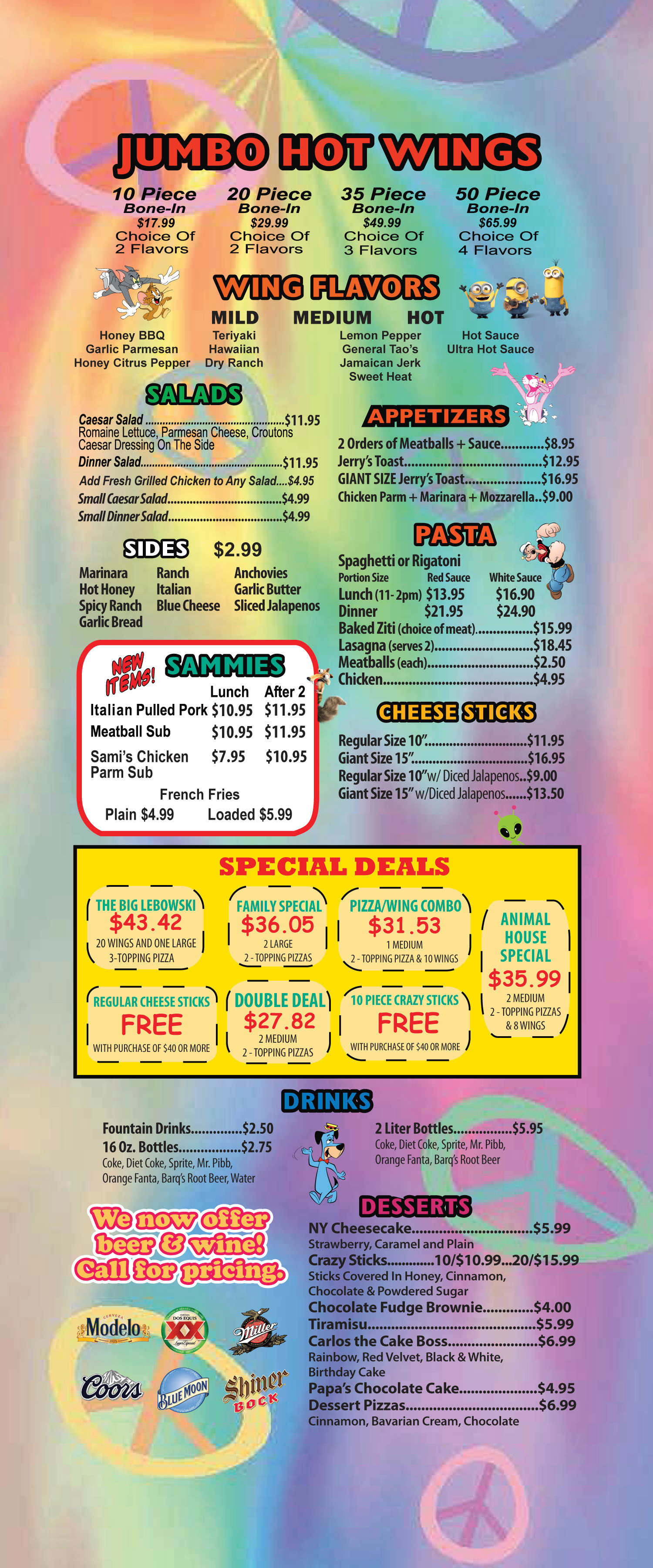 Beyond pizza, our menu features jumbo wings in 13 bold flavors, classic Italian pasta with lunch specials before 2 PM, hearty sandwiches, appetizers and sides, and decadent desserts including cheesecake, tiramisu, and our famous dessert pizzas.