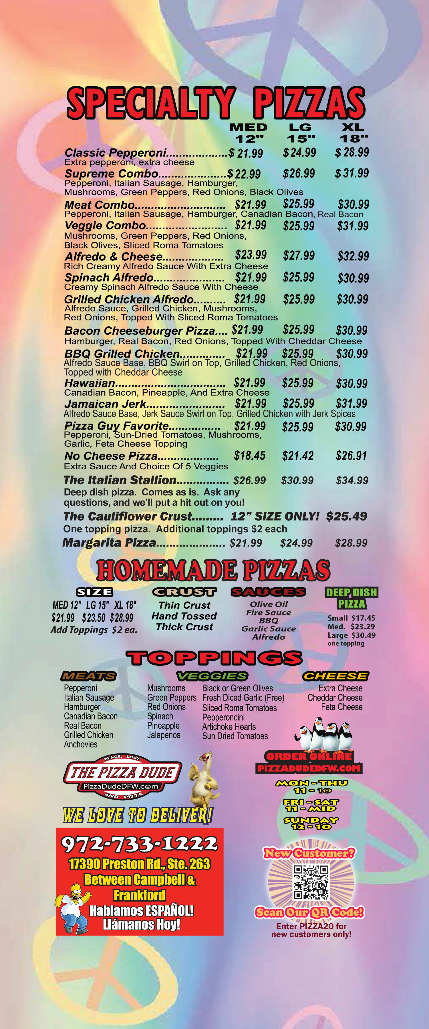 We deliver to Preston Highlands, Addison, Carrollton, and the greater North Dallas area. We also deliver beer and wine with your food order. Check our current specials for combo deals and weekly promotions.